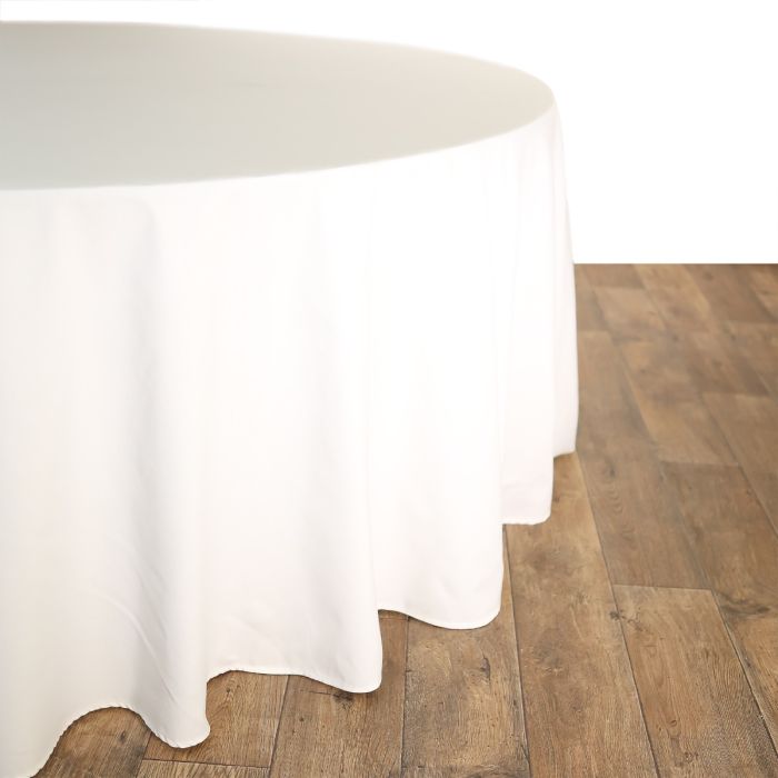 Ein rundes, bodenlanges Tischtuch D320 cm im Farbton OFF-White / Altweiß /Cremeweiß - passend für Banketttische D180 cm oder Stehtische D80 cm. Das Tischtuch hat einen tollen Faltenurf und ist ideal für Hochzeiten oder feine Dinner geeignet.